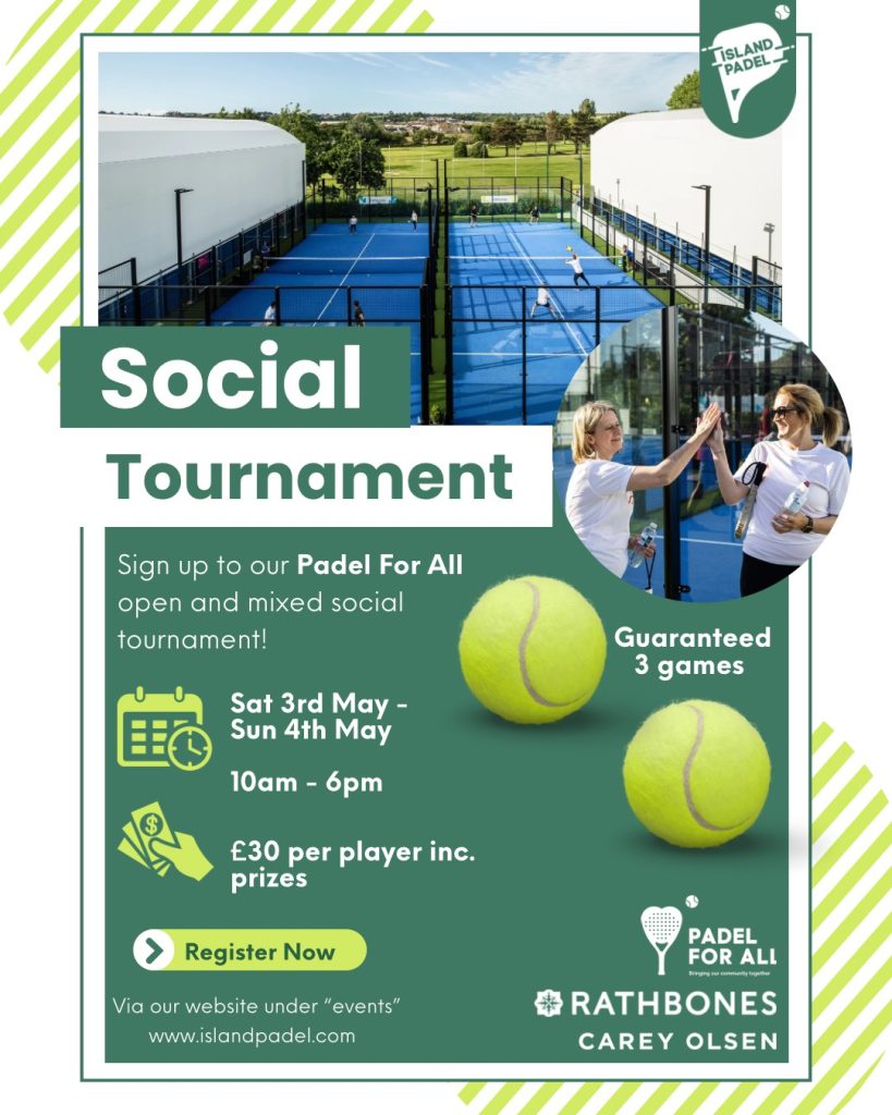 Padel for All Social Tournament, over the weekend of Saturday 3rd & Sunday 4th May – and generously supported by Rathbones & Carey Olsen.